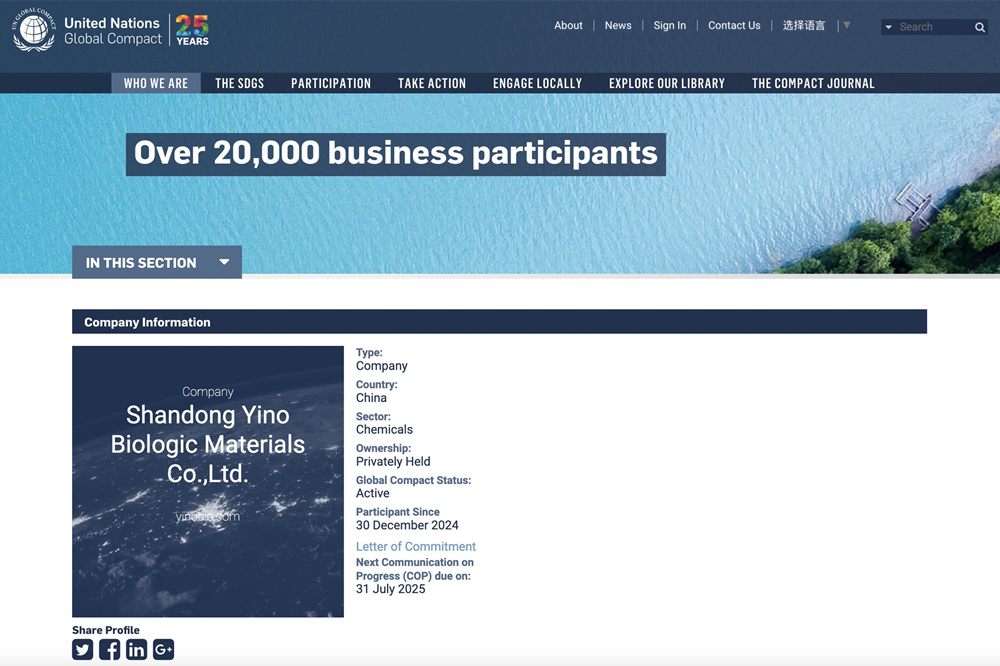 [May, 2025] Shandong YINO Bio-Group, a leading innovator in bio-based raw materials, has joined the United Nations Global Compact (UNGC), the world's largest sustainability initiative. By aligning with the UNGC’s Ten Principles in human rights, labor, environment, and anti-corruption, YINO Bio-Group reaffirms its commitment to the vision of “Greening Our Practices, Preserving Our Planet.” This milestone not only marks a significant step in YINO Bio-Group’s internationalization and globalization journey but also reflects international recognition of its relentless efforts in advancing sustainable development.