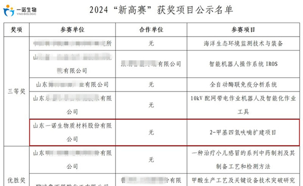 山東省工業(yè)和信息化廳公示2024年“山東制造·齊魯精品”名單,山東一諾生物質(zhì)材料股份有限公司的“糠醇”產(chǎn)品入選。